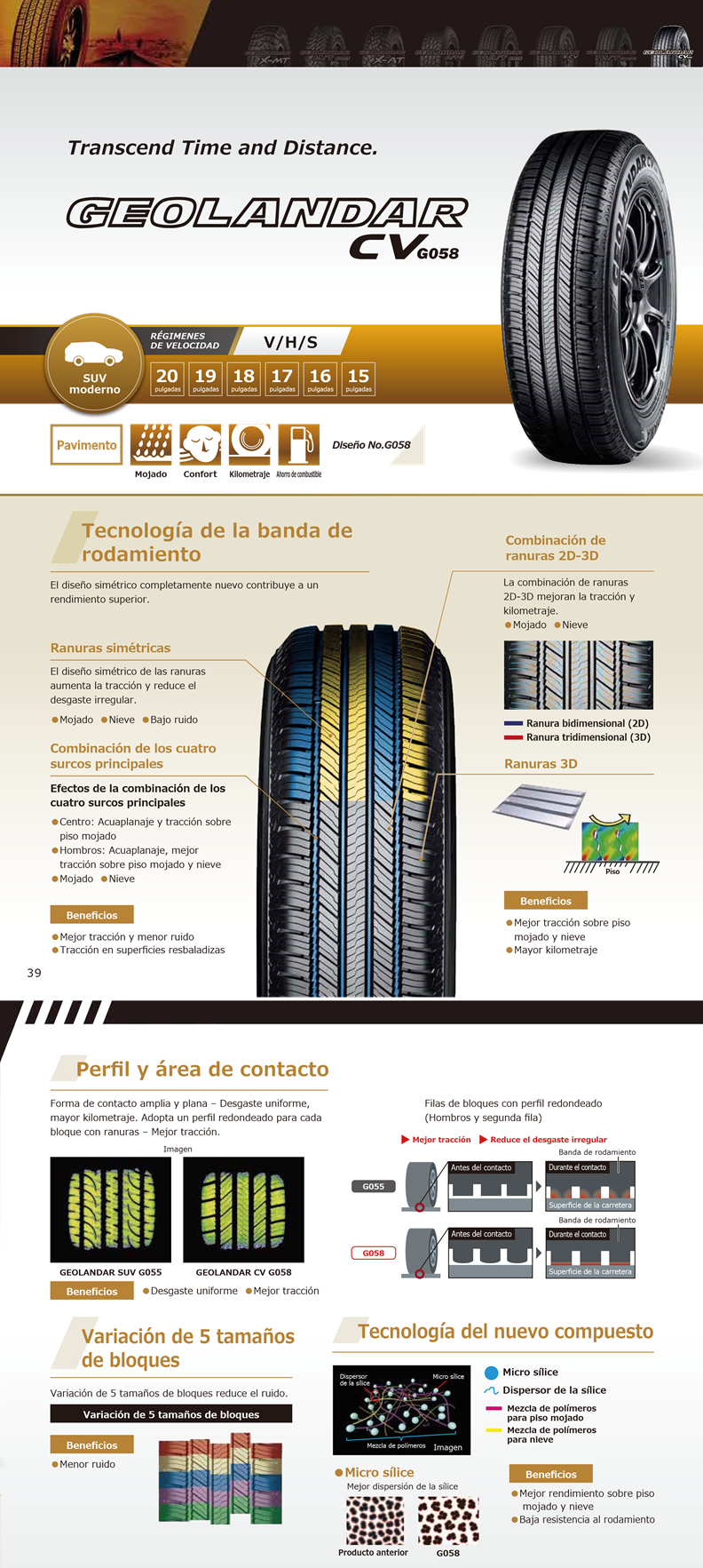 Se aumentó la resistencia del caucho de la pared lateral en los neumáticos de gran altura para SUV y se reforzó la rodadura en la parte del hombro, aumentando de esa manera la estabilidad de la superfi cie de contacto con el suelo. La gran rigidez ofrece una mejor maniobrabilidad y más tranquilidad a altas velocidades.